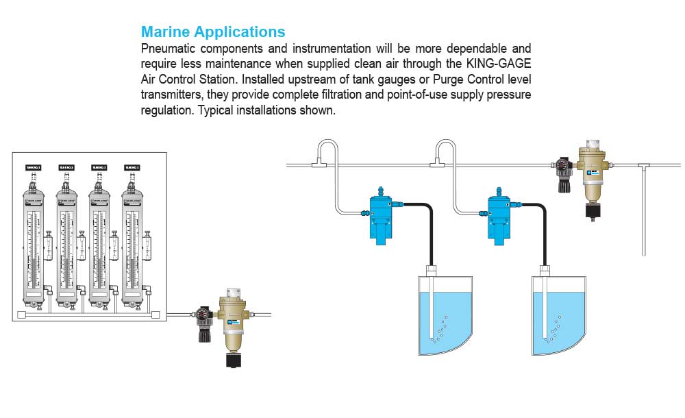 N/A Pneumatic components and instrumentation will be more dependable and require less maintenance when supplied clean air through the KING-GAGE Air Control Station. Installed upstream of tank gauges or Purge Control level transmitters, they provide complete filtration and point-of-use supply pressure regulation. |