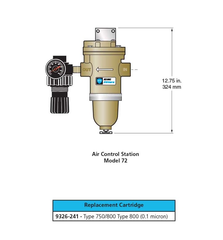 KING Filters Air Control Station is recommended for shipboard use to protect air operated equipment and instrumentation. Without question, most shipboard compressed air systems contain solid and liquid contaminants that affect performance and increase wear on equipment. Precision pneumatic instrumentation including KING-GAGE tank level gauging systems require clean, dry and oil-free compressed air for trouble free operation. Model 74 Air Control Station is based on the KING Air-Guard Bronze Filter with automatic drain combined with a pressure regulator and dial gauge. The high efficiency 20 scfm two stage filter uses a self-draining coalescing element to remove large amounts of solid liquid contaminants from the airline. If an automatic drain is not desired, the Model 72 Air Control Station is based on the Air-Guard Bronze Filter with manual drain petcock. This version of the station also includes a filter, pressure regulator and dial gauge. Ensure clean air with our two-stage combination 750 Scrubber and 800 Polisher cartridge set which removes 99.7% of particulate down to 0.1 micron. The coalescing action in the first stage cartridge provides longer service for both cartridges elements while delivering dry, virtually oil-free compressed air. KING Filter cartridges provide equal efficiency regardless of flow rate and do not diminish during the life of the elements. (Assumes periodic draining of sump or use of automatic sump.) |