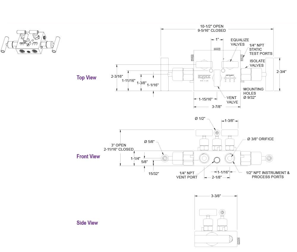 N/A The Flare Pattern™ valve configuration (FP) is an available option on NOSHOK 5030/5130 and 5530 Series 5-valve natural gas manifold valves. The equalization valves and vent valve on these manifolds are angled to provide maximum clearance for fingers during operation. |