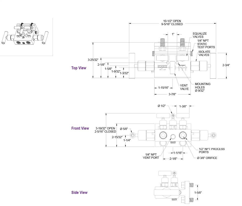 N/A Two static (test) ports, color coded vinyl bonnet and stem dust cap, patented soft tip stem design on equalizing and vent valves. |