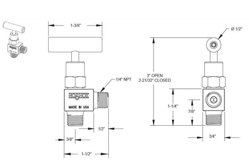 Please note that the standard o-ring in all the NOSHOK mini valves is FKM and the standard handles are brass round knurled handles (HL3), steel 1-3/8" mini "T" handles (HL7), and 316SS 1-3/8" mini "T" handles (HL7)