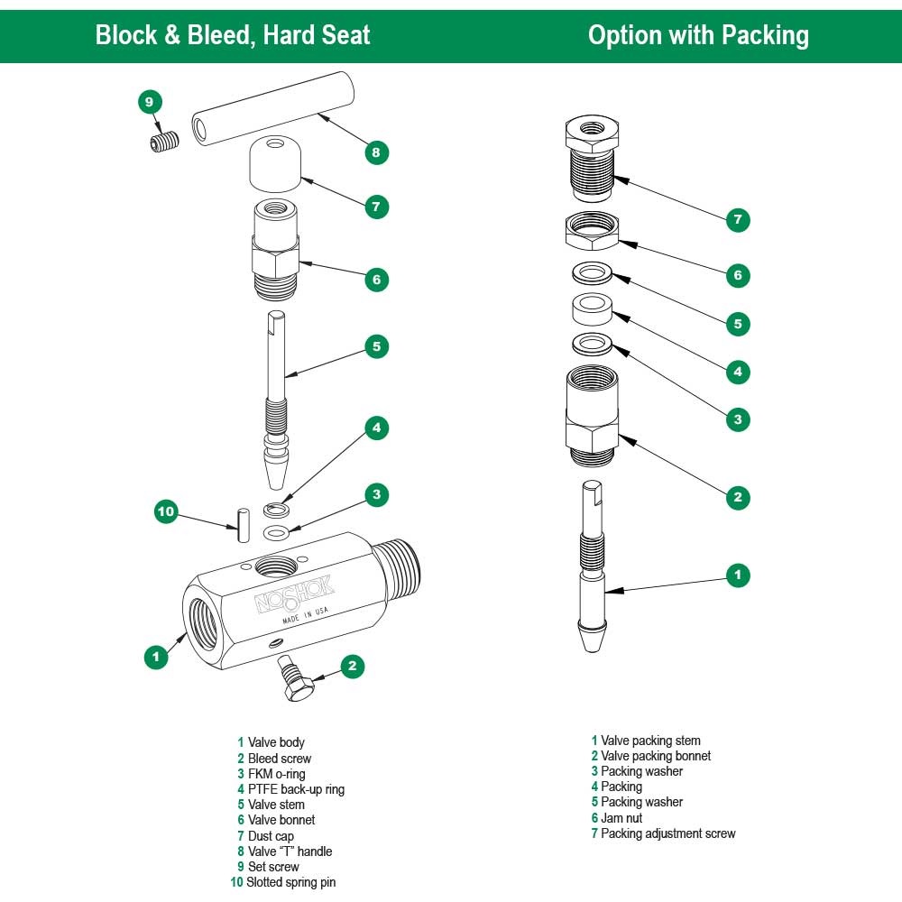 Please note that the standard o-ring in all the NOSHOK valves is FKM and the standard handles are "T" handles (HL2). The handle material will always match the material of the valve, unless otherwise specified. For example, the "T" handle (HL2) on the 602-FFC will be steel. When only the standard configuration is needed, no additional designations are necessary. Please consult the factory for special application requests. All NOSHOK valve products conform to the MSS SP-99 instrument valves standards, and valves supplied with packing also conform to MSS SP-132 compression packing systems for instrument valves standard. O-Ring - Other o-ring materials available on request. |